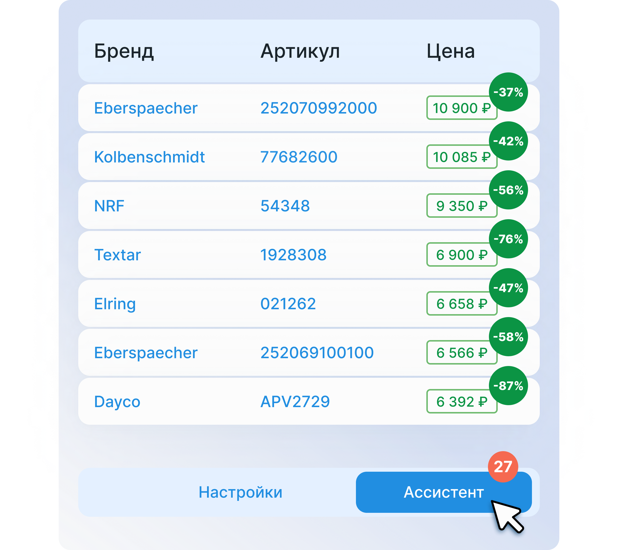 Ассистент QWEP полностью автоматизирует функционал по отслеживанию лучших цен на запчасти и мониторингу дефицитных позиций запчастей.